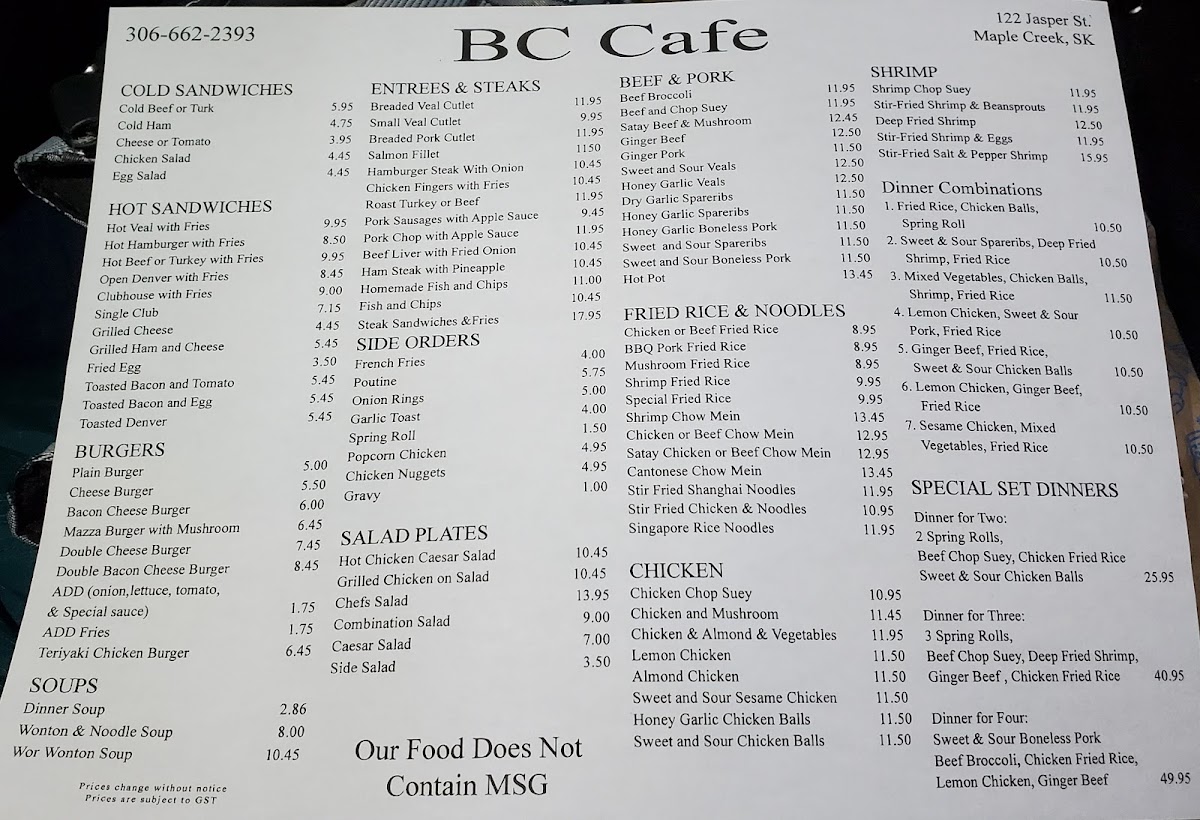 Welcome to B C Cafe, a cherished culinary gem located at 122 Jasper St in Maple Creek, Saskatchewan. This historic establishment captures the essence of a family-run diner, offering both hearty Chinese and classic Western fare in an inviting, albeit unpretentious setting. The massive menu is a standout feature, catering to varied tastes and ensuring that every diner finds something to love.